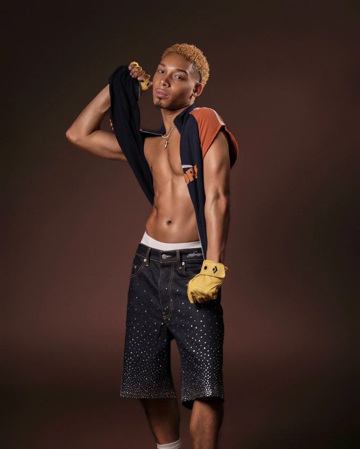 • A young man with dark curly hair and earrings, shirtless, wearing black leather gloves, pants, and a vest, standing against a plain background.
